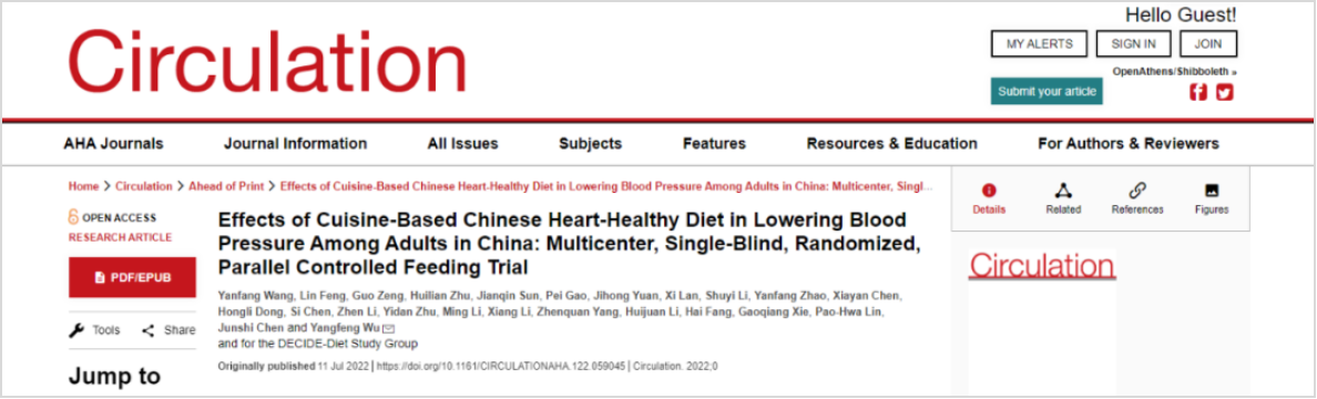 2022年7月11日,美国心脏协会旗舰期刊《循环》刊发了北京大学临床研究所教授武阳丰与研究员王燕芳团队新成果。研究者对265名高血压患者的最新研究发现,高血压患者食用“中国心脏健康膳食”四周后,收缩压和舒张压平均可显著下降10.0毫米汞柱、3.8毫米汞柱。这项成果意味着世界第三大健康膳食——“中国心脏健康膳食”成功开发,为高血压患者通过健康饮食控制血压提供方案和信心。